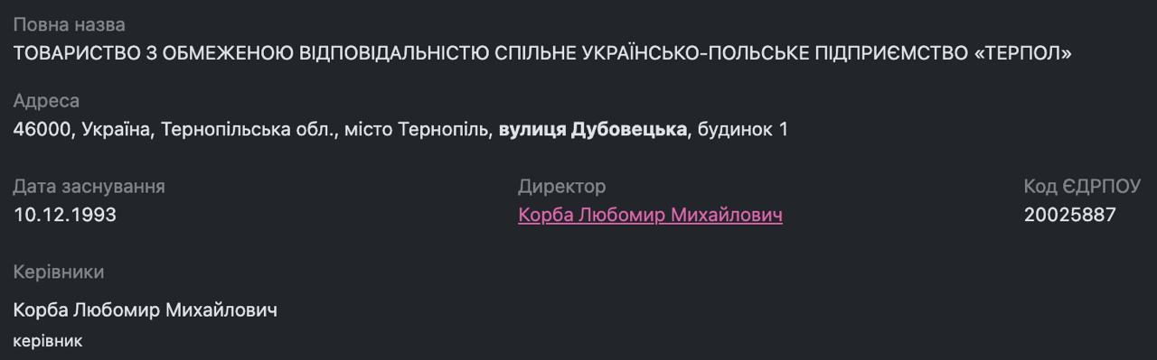 В украинских базах данных есть информация о том, что Любомир Корба в 1993 году возглавлял украинско-польское ООО "Терпол", зарегистрированное в Тернополе.