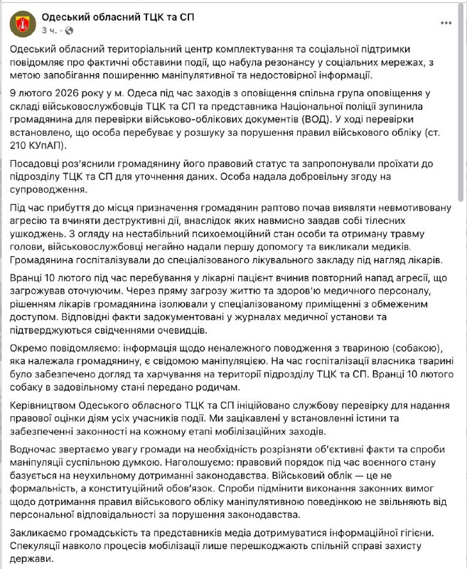 В областном ТЦК сегодня прокомментировали ставшую резонансной историю и заявили, что мужчина разбил себе голову сам: "Гражданин внезапно начал проявлять немотивированную агрессию и совершать деструктивные действия, в результате которых намеренно нанес себе телесные повреждения. Учитывая нестабильное психоэмоциональное состояние личности и полученную травму головы, военнослужащие немедленно оказали первую помощь и вызвали медиков. Гражданин госпитализирован в специализированное лечебное учреждение под наблюдение врачей. Утром 10 февраля во время пребывания в больнице пациент совершил повторное нападение агрессии, что угрожало окружающим. Из-за прямой угрозы жизни и здоровью медицинского персонала решением врачей гражданина изолировали в специализированном помещении с ограниченным доступом".