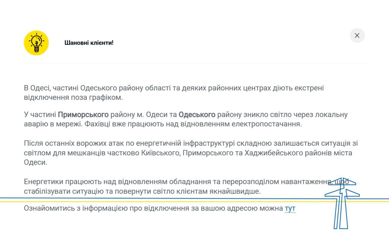 Речь идет о Приморском и Одесском районах, чья энергетика пострадала от ударов. Сейчас энергетики пытаются перераспределить напряжение чтобы решить проблему.