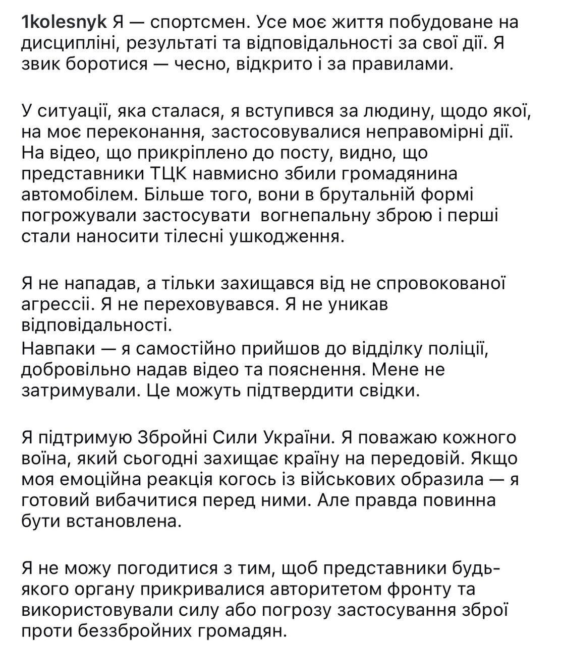 "В ситуации, которая произошла, я вступился за человека, относительно которого, по моему убеждению, применялись неправомерные действия. На видео, прикрепленном к посту, видно, что представители ТЦК намеренно сбили гражданина автомобилем. Более того, они в грубой форме угрожали применить огнестрельное оружие и первыми стали наносить телесные повреждения. Я не нападал, а только защищался от неспровоцированной агрессии", - написал спортсмен.