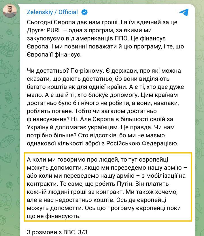В интервью BBC он заявил, что европейские страны могли бы профинансировать переход от мобилизационной модели к контрактной системе. По его словам, в России военнослужащим платят за подписание контракта, и Украина хотела бы действовать так же, однако не имеет достаточных средств.