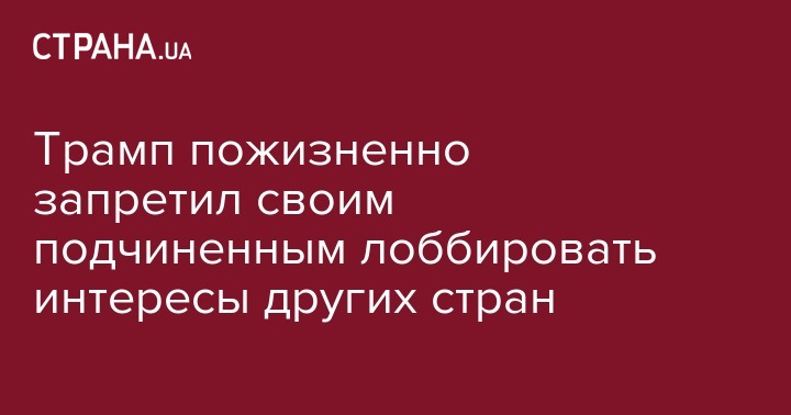 Президент США Дональд Трамп в субботу подписал указ, который вводит для сотрудников его администрации пожизненный запрет на лоббирование интересов иностранных государст. Лоббирование интересов любых других организаций возможно не ранее, чем через пять лет после отставки.