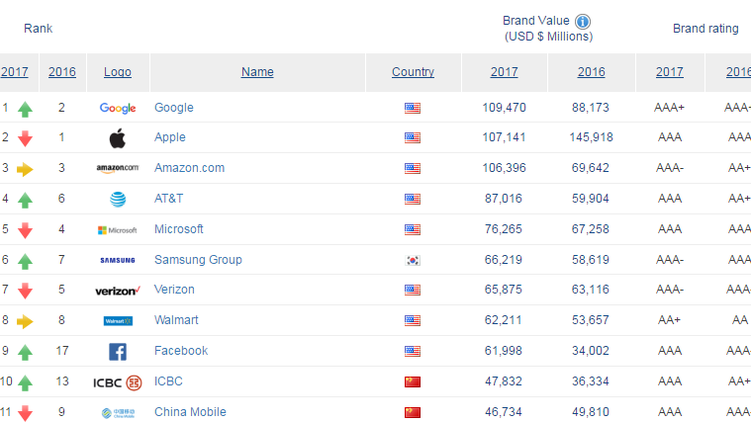 Рейтинг самых дорогих брендов мира в 2017 году, brandirectory.com