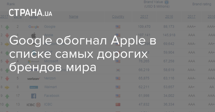 Составители рейтинга констатировали, что стоимость Google за год выросла на 24% и составила $109,47 млрд. В то же время стоимость бренда Apple подешевела на 27% и составила $107,141 млрд.