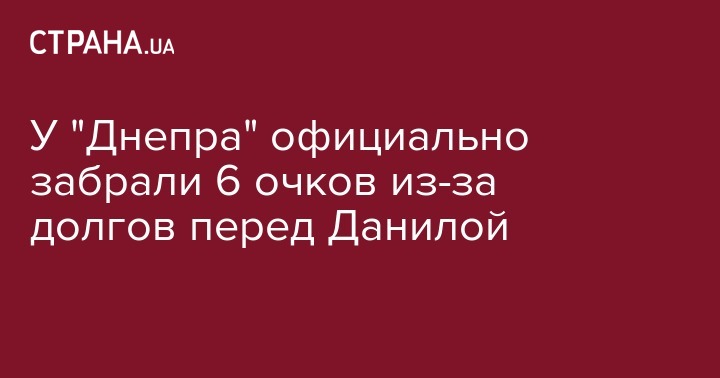 С футбольного клуба "Днепр" официально сняты еще 6 очков в турнирной таблице украинской Премьер-лиги чемпионата Украины. Такой спортивный штраф наложен на клуб из-за долгов по заработной плате перед бывшим игроком "Днепра" Данило Соузой.