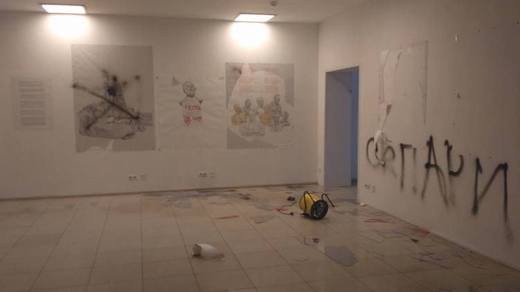 По словам сотрудников центра, нападавших было до 15 человек. Они избили охранника, сорвали работы и исписали стены в выставочном зале словами "Слуги Москвы", "Сепары" и "Слава Украине".