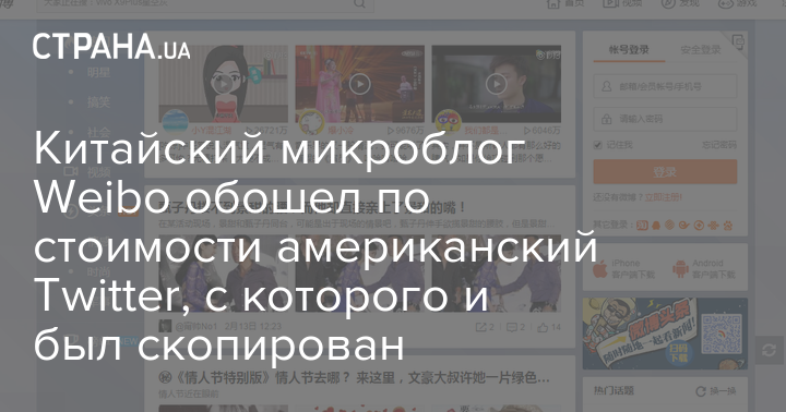 Китайский микроблог Weibo обошел по стоимости американский Twitter, с которого и был скопирован