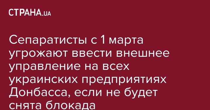 "Киев, используя радикалов, организовал и продолжает блокаду железнодорожных путей, угрожает блокадой автомобильных дорог... Многие предприятия были вынуждены остановить свою работу. Мы вынуждены объявить, что, если до 00.00 среды (1 марта 2017 года) блокада не будет снята, то мы введём внешнее управление на всех предприятиях украинской юрисдикции, - заявили "главы ЛНР и ДНР". - Мы перестанем поставлять уголь на Украину. Для поставок угля нет ни возможности, ни схемы оплаты. Мы будем перестраивать все производственные процессы и ориентировать их на рынок России и других стран".