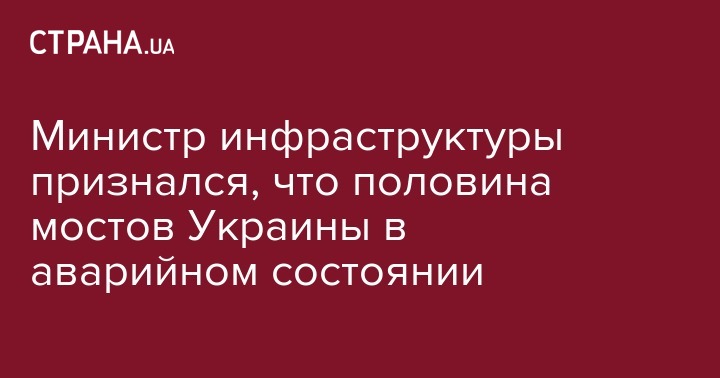 Министр инфраструктуры Украины Владимир Омелян сообщил, что в Украине около 8 тысяч различных мостов находятся в аварийном состоянии. По его словам, сразу около 4 тысяч украинских мостов требуют немедленного капитального ремонта.