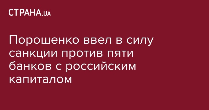 Президент Петр Порошенко ввел в действие решение Совета национальной безопасности и обороны (СНБО) Украины о применении санкций к пяти банкам с российским капиталом, сообщила пресс-служба главы государства. Об этом сообщается на странице президента в Facebook.