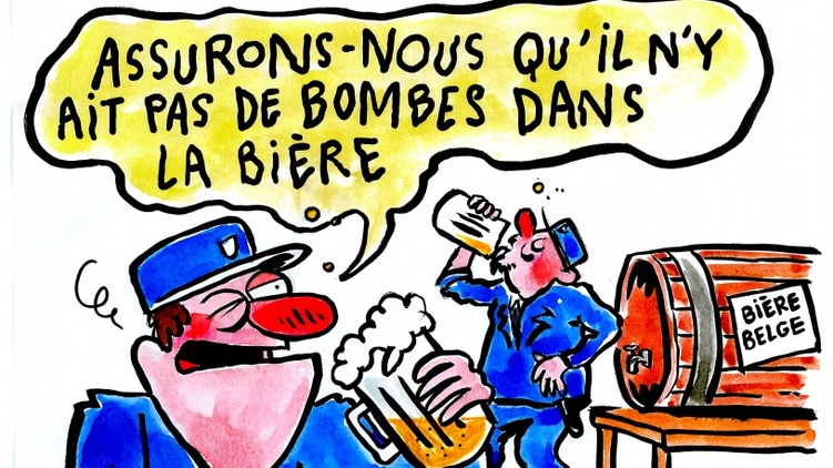 На ней изображены пьяные бельгийские полицейские, которые пьют пиво из бокалов. Сама карикатура сопровождается таким заголовком - "Теракты: Бельгия принимает меры".