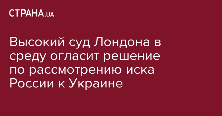 В среду, 29 марта 2017 Высокий суд Лондона обнародует решение о сроках и процедуре рассмотрения иска России к Украине по "кредиту Януковича" - фактическом долге по государственным евробондам на $3 млрд. Решение будет обнародовано в 9:30 по лондонскому времени (11:30 по Киеву), сообщает Интерфакс.