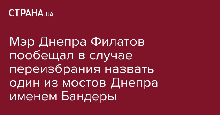 Мэр Днепра Борис Филатов пообещал своим избирателям в случае переизбрания градоначальником назвать один из мостов через Днепр именем Степана Бандеры.