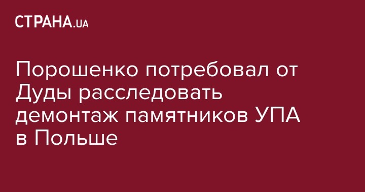 Президент Петр Порошенко в телефонном разговоре с польским президентом Анджеем Дудой осудил демонтаж памятника в Польше в честь Украинской повстанческой армии, потребовав соответствующей реакции от властей соседней страны.