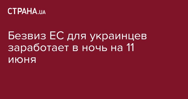 На практике безвизовый режим с Евросоюзом вступит в силу в ночь на 11 июня. Об этом сообщает "Интерфакс-Украина".