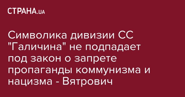 "В указанном перечне символика 14-й гренадерской дивизии войск СС "Галичина" (1-й Украинской дивизии УНА) отсутствует. Учитывая это, символика 14-й гренадерской дивизии войск СС "Галичина" (1-й Украинской дивизии УНА) в соответствии с действующим законодательством Украины не является символикой национал-социалистического (нацистского) тоталитарного режима, распространение или публичное использование которых в Украине запрещено", - написал Владимир Вятрович.