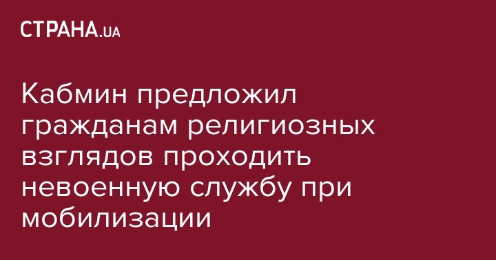 Кабинет Министров предлагает Верховной Раде разрешить гражданам при мобилизации проходить альтернативную (невоенную) службу из-за религиозных убеждений. Об этом сообщают "Украинские Новости".