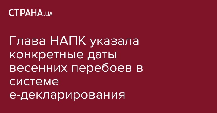 Перебои в работе системы электронного декларирования имели место 2, 12, 15, 16, 19, 24, 26, 27 и 28 марта 2017 года. Об этом Глава Национального агентства по вопросам предотвращения коррупции (НАПК) Наталия Корчак написала на своей странице в Facebook.
