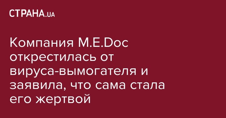 Компания M.E.Doc отрицает причастность к распространению вируса Petya.A и подчеркивает, что сама подверглась заражению. Об этом идет речь в пресс-релизе на официальном сайте компании.
