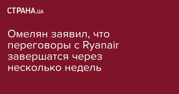 Министр инфраструктуры Владимир Омелян дал прогноз, что переговоры с лоукостером Ryanair о начале работы в Украине завершатся через несколько недель. Об этом он сказал в программе "Подробности" на телеканале "Интер".