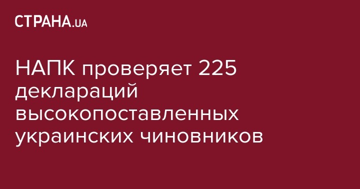 Национальное агентство по вопросам предотвращения коррупции (НАПК) производит проверку 225 электронных деклараций об имуществе и доходах высокопоставленных чиновников. Об этом заявила глава ведомства Наталья Корчак, пишет "Интерфакс-Украина".