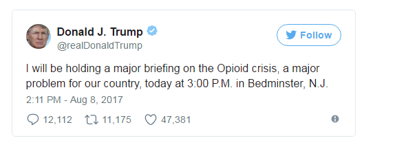"Сегодня в 15:00 я проведу большое совещание по поводу кризиса опиоидов - крупнейшей проблемы нашей страны", - написал он во вторник, 8 августа 2017 в своем микроблоге Twitter.