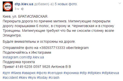 "Митингующие перекрыли дорогу покрышками 6 полос, в сторону м. Черниговская и в сторону Троещины", - говорится в опубликованном сообщении.