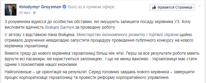 "Он принял это решение самостоятельно. С пониманием отнесся к личным обстоятельствам, которые заставляют покинуть пост руководителя УЗ. Хочу выразить благодарность Войцеху Балчуну за проведенную работу", - пишет премьер.