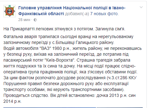 В Ивано-Франковской области на нерегулируемом железнодорожном переезде в селе Бильшивци поезд врезался в автомобиль, в результате чего погибла супружеская пара с двумя детьми. Об этом сообщает пресс-служба местной полиции в Facebook.