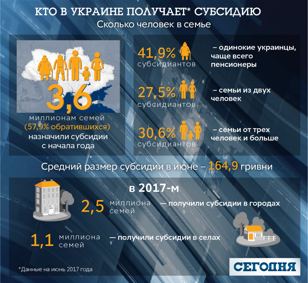 По подсчетам Министерства социальной политики, уже этой зимой число субсидиантов может увеличиться до 9 миллионов семей (всего в Украине 15 миллионов домохозяйств). В прошлом году Министерство финансов рассчитало: на программу субсидий в 2017-м понадобится 47 миллиардов гривен, однако уже в мае стало понятно – денег не хватит. Кабинету министров пришлось вносить правки и увеличить бюджет до 61 миллиарда гривен.