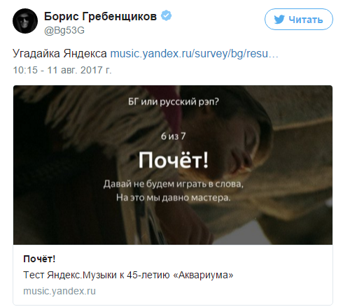 Популярный российский музыкант Борис Гребенщиков опубликовал в Twitter результат теста, созданного "Яндекс.Музыкой" в честь 45-летия группы "Аквариум". Оказалось, что исполнитель не смог без ошибок отличить свои тексты от текстов современных рэперов. Неизвестно, какой именно вопрос поставил в тупик музыканта.