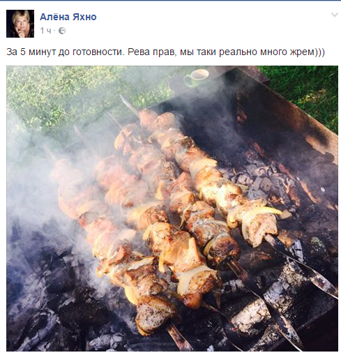 Она подписала фото шашлыка "5 минут до готовности, Рева прав, мы таки реально много жрем"