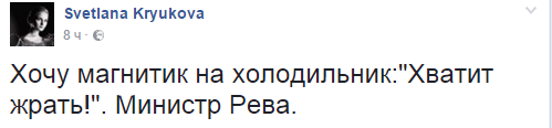 Главный редактор "Страны" Светлана Крюкова хочет магнит на холодильник с надписью "Хватит жрать" и подписью министра Ревы.
