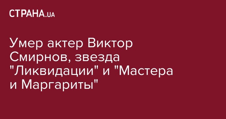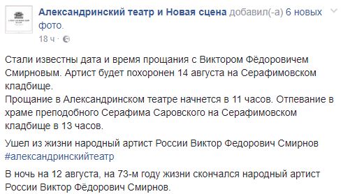 В ночь на 12 августа, на 73-м году жизни скончался народный артист России Виктор Смирнов. Об этом сообщается на Fаcebook Александринского театра (Санкт-Петербург).