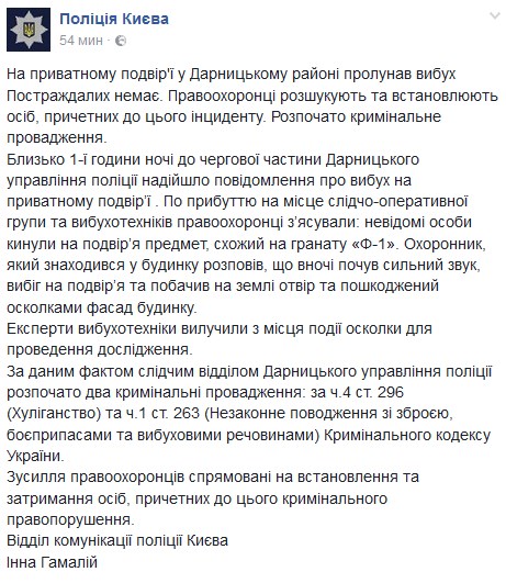 Около 1:00 часа ночи дежурная часть Дарницкого управления полиции получила сообщение о взрыве на частном подворье. На месте следственно-оперативная группа и взрывотехники выяснили, что кто-то бросил во двор предмет, похожий на гранату "Ф-1". Охранник, который находился в доме, рассказал, что ночью услышал сильный звук, выбежал во двор и увидел на земле воронку и поврежденный осколками фасад дома.