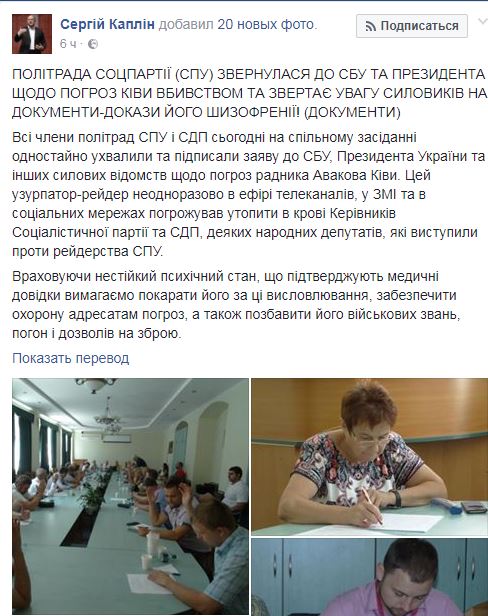 Политсовет Социалистической партии единогласно поддержал заявление в СБУ относительно угроз Ильи Кивы насчет убийств активистов партии. Об этом сообщил депутат Рады Сергей Каплин на своей странице в Facebook.