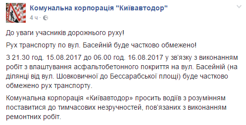 - с 21:30 15 августа до 6:00 16 августа в связи с обустройством асфальтобетонного покрытия на ул. Бассейной (от ул. Шелковичной до Бессарабской площади);