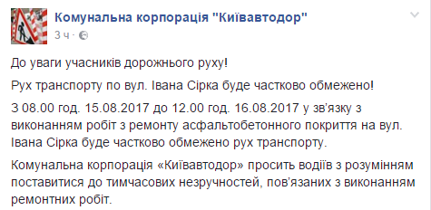 - с 8:00 15 августа до 12:00 16 августа в связи ремонтом дорожного покрытия на ул. Ивана Сирко.