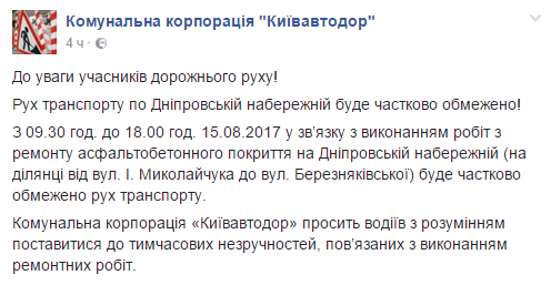 - с 09:30 до 18:00 15 августа в связи с ремонтом дорожного покрытия на Днепровской набережной (от ул. И. Миколайчука до ул. Березняковской);