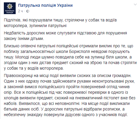 В Борисполе группа подростков стреляла из пневматического пистолета в собак и водителей мотороллеров возле школы. Об этом в Facebook сообщает патрульная полиция Украины.