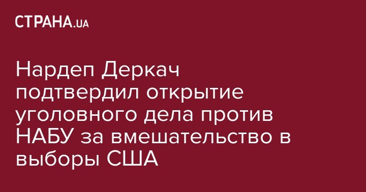 Внефракционный нардеп Андрей Деркач подтвердил, что Генеральная прокуратура Украины открыла уголовное производство по факту вмешательства сотрудников Национального антикоррупционного бюро Украины в выборы президента США в 2016 году. Об этом он сообщил на своей странице в Facebook.
