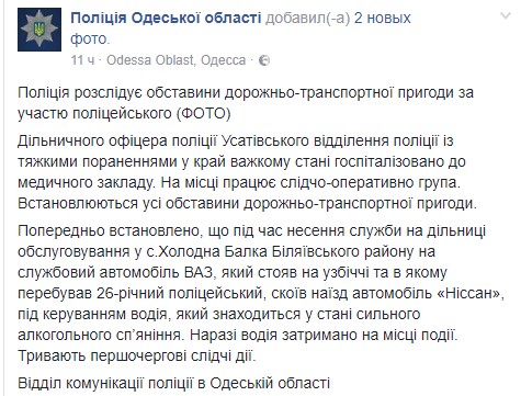 В с. Холодная Балка Беляевского района Одесской области пьяный водитель врезался в машину патрульного полицейского на служебном посту. Об этом сообщает полиция области в Facebook.