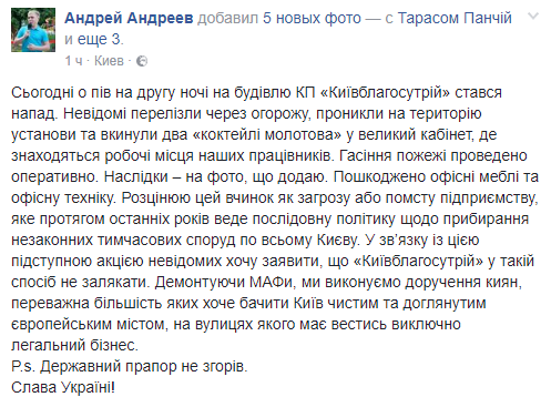 "Расцениваю этот поступок как угрозу или месть предприятию, которое в течение последних лет ведет последовательную политику по уборке незаконных временных сооружений по всему Киев", - написал Андреев.