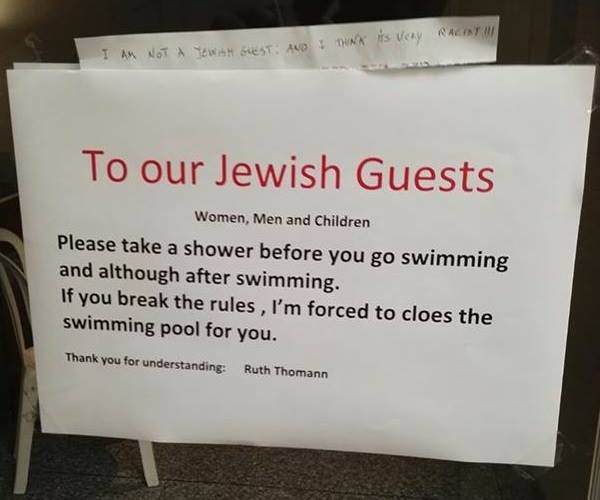 Швейцарский отель вызвал возмущение общественности после того, как вывесил знак, призывающий своих постояльцев-евреев принимать душ перед тем, как идти в бассейн.