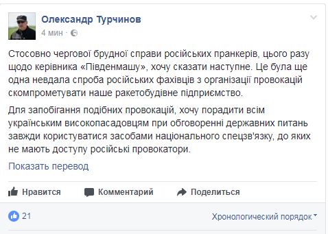 Секретарь Совета национальной безопасности и обороны (СНБО) Украины Александр Турчинов расценивает розыгрыш гендиректора ГП "Южный машиностроительный завод им.Макарова" Сергея Войта российскими пранкерами как попытку скомпрометировать предприятие. Об этом Турчинов написал на своей странице в соцсети Facebook.