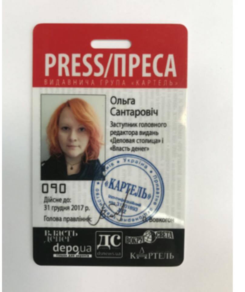 Как сообщалось официально на сайте издания "одна из якобы журналисток пришла по фальшивому удостоверению издательской группы "Картель", в состав которой входит "Деловая столица". ЧАО "Картель" сообщает, что удостоверение данной особе никогда не выдавалось и удостоверение под этим номером принадлежит нашему штатному сотруднику. Удостоверения издательской группы имеют другой вид - они являются пластиковыми, а не ламинированными. Удостоверение под номером 090 было выдано заместителю главного редактора изданий "Деловая столица" и "Власть денег" Ольге Сантарович, а не Анжелине Диаш де Кинташ, как указано в поддельном документе".