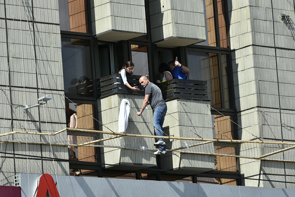 В центре Киева, на карнизе гостиницы "Крещатик" обосновался мужчина, который угрожает спрыгнуть и покончить с собой. Потенциальный самоубийца требовал визита консула России. На балконе здания, примыкающего к сетке, дежурил охранник отеля, который пытался уговорить мужчину перелезть с сетки на балкон.