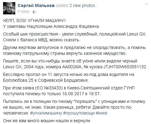У заместителя главы Нацполиции Александра Фацевича угнали служебный автомобиль Lexus GX. Об этом написал редактор программы "Гроши" Сергей Мальнев у себя в Facebook.