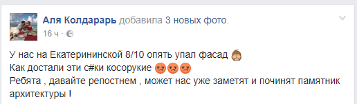 "Как достали эти с#ки косорукие. Ребята , давайте репостнем , может нас уже заметят и починят памятник архитектуры!", - призывает очевидец Аля Колдарарь.