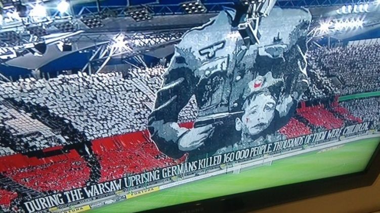 Во время футбольного матча, польские фаната развернули баннер с изображением солдата в нацистской форме, который приставил пистолет к голове польского мальчика.